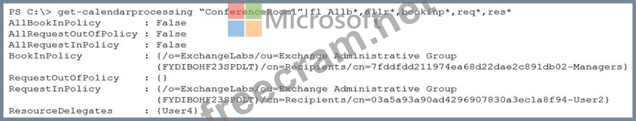 The BookInPolicy allows the Managers group. User1 is in the Managers group so User 1 can book ConferenceRoom1 automatically without the approval of User4.