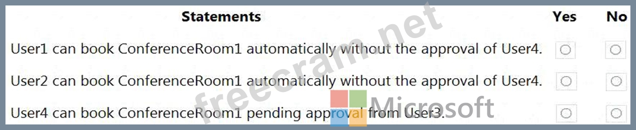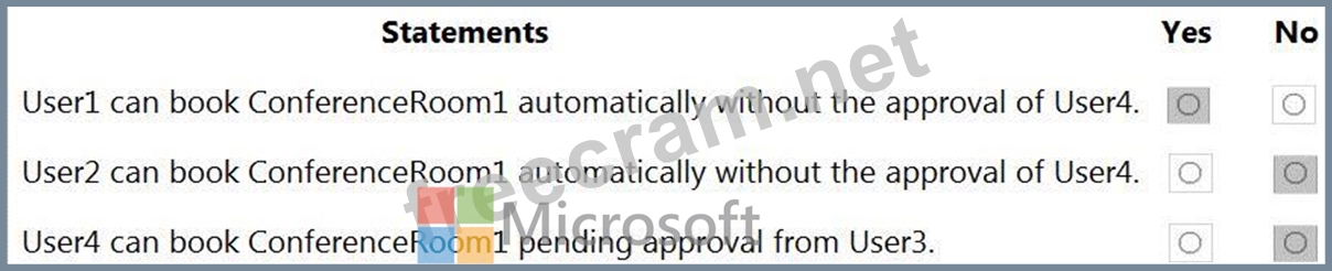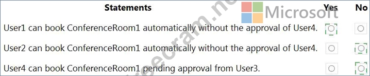 The BookInPolicy allows the Managers group. User2 is not in the Managers group so User 2 cannot book ConferenceRoom1 automatically without the approval of User4.