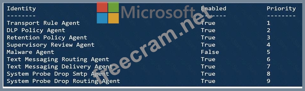 You run the Get-TransportAgent cmdlet and receive the output shown in the following exhibit.