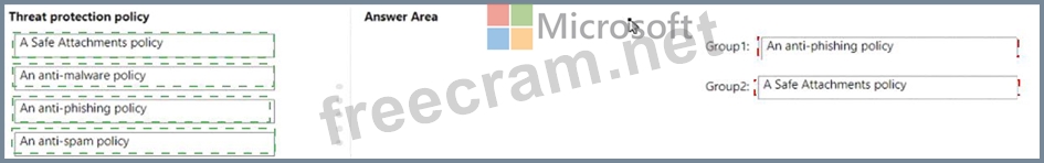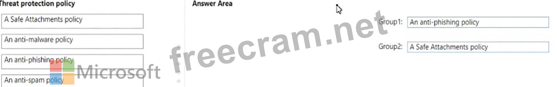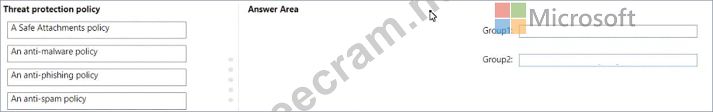 Which threat protection policy should you configure for each group? To answer, drag the appropriate policies to the correct groups. Each policy may be used once, more than once, or not at all. You may need to drag the split bar between panes or scroll to view content.