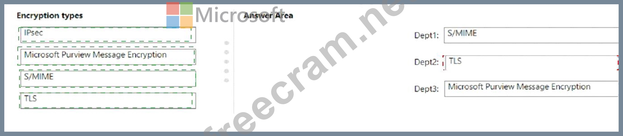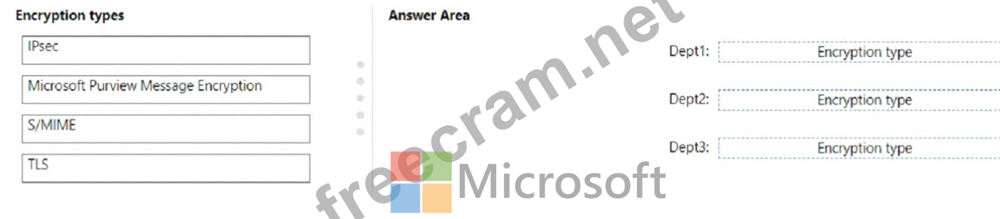 'Which type of encryption should you use for each department? To answer, drag the appropriate encryption types to the correct departments. Each encryption type may be used