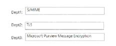 Email messages sent from Dept3 to an external email domain should use Microsoft Purview Message Encryption2. Microsoft Purview Message Encryption is an online service that encrypts email messages and attachments using rights management policies2. It allows users to send encrypted email messages to anyone inside or outside the organization using various email services2. Microsoft Purview Message Encryption provides persistent encryption and ensures message confidentiality and authorization policies2.