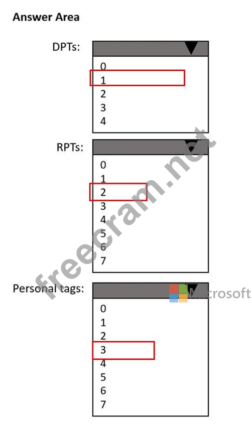How many default policy tags (DPTs), retention policy tags (RPTs), and personal tags should you create to meet the retention requirements? To answer, select the appropriate options in the answer area.