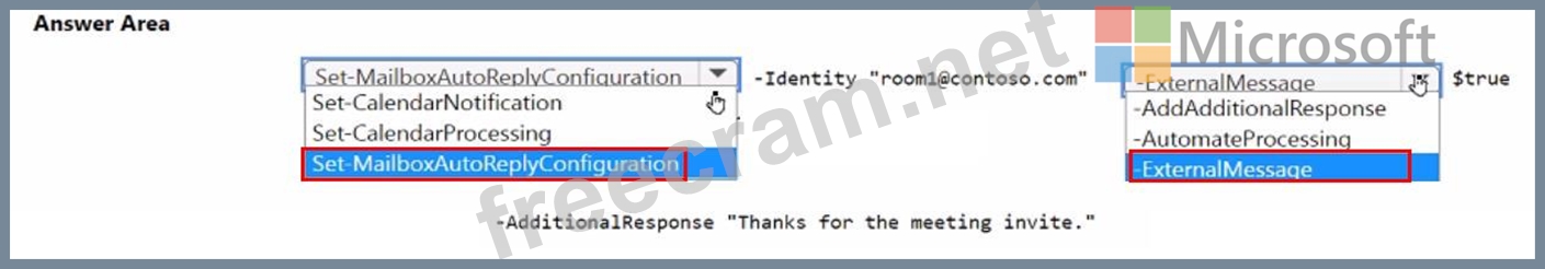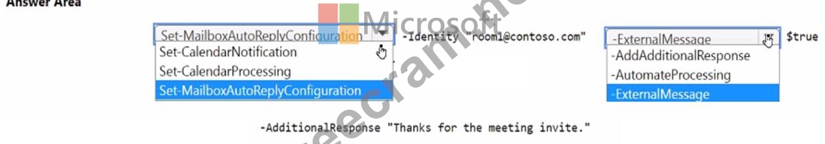 You have a Microsoft Exchange Online tenant named contoso.com that contains a resource mailbox named Room1. You need to configure Room1 to send the following automatic response message: "Thanks for the meeting invite." How should you complete the command? To answer, select the appropriate options in the answer area.