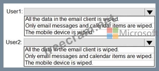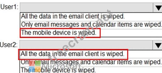 From the Exchange admin center, you issue a Wipe Data command for User1 and User2.