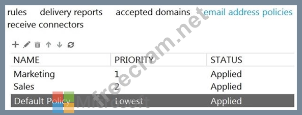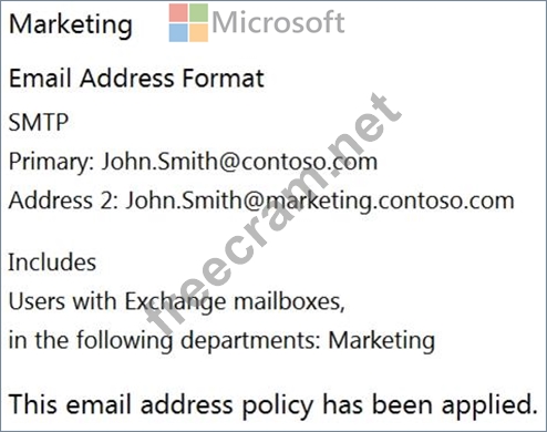 Email address policies for contoso.com are configured as shown in the Address Policies exhibit.