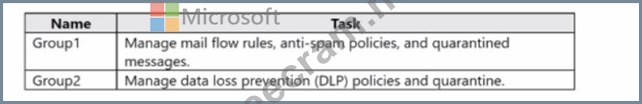 You need to add Group1 and Group2 to role groups. The solution must use the principle of least privilege.