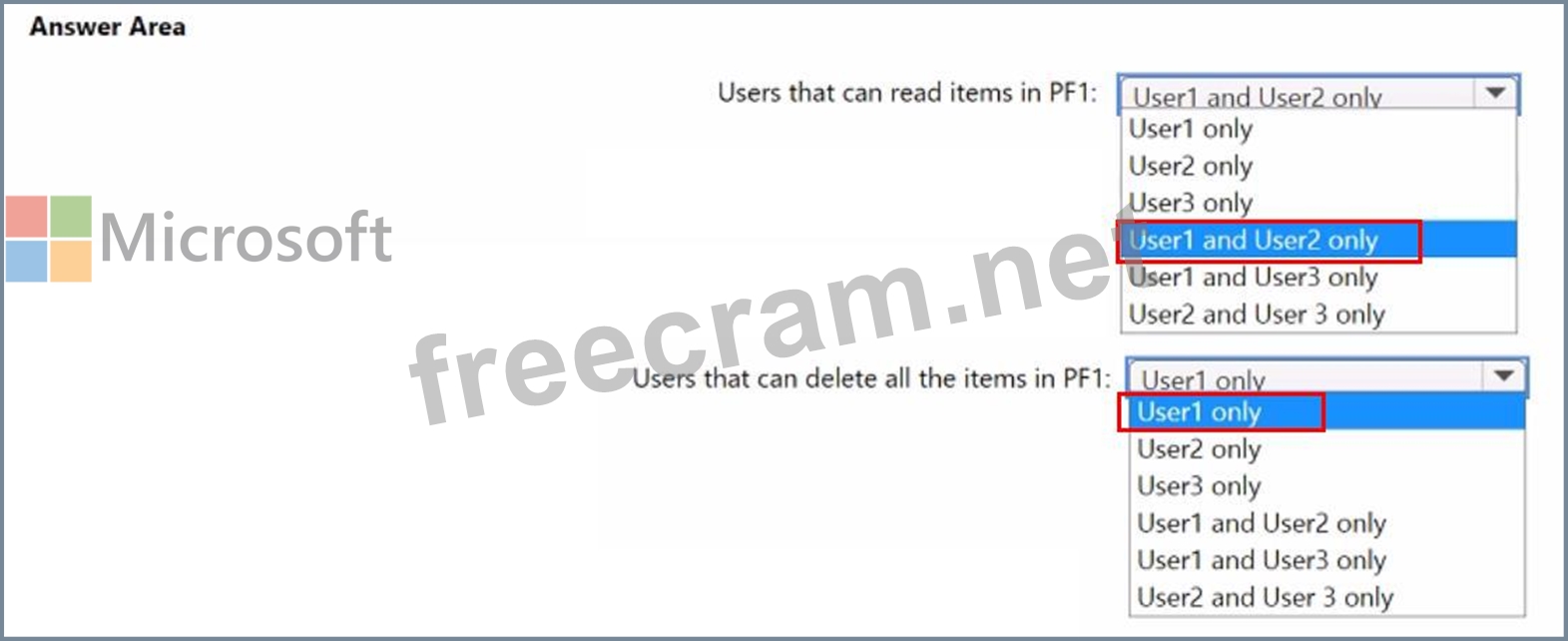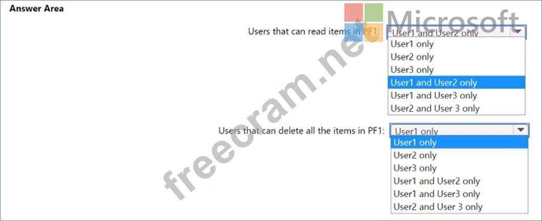 Which users can read items in PF1, and which users can delete all the items in PF1? To answer, select the appropriate options in the answer area.