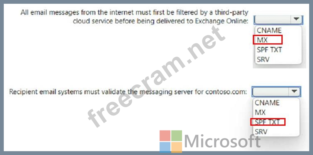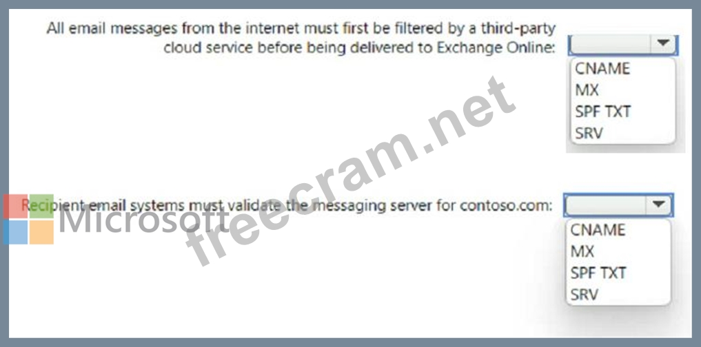 « Recipient email systems must validate the messaging server for contoso.com) Which type of DNS record should you use for each requirement? To answer, select the appropriate options in the answer area.