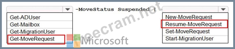 Which PowerShell command should you run to complete all the suspended mailbox migrations? To answer, select the appropriate options in the answer area.