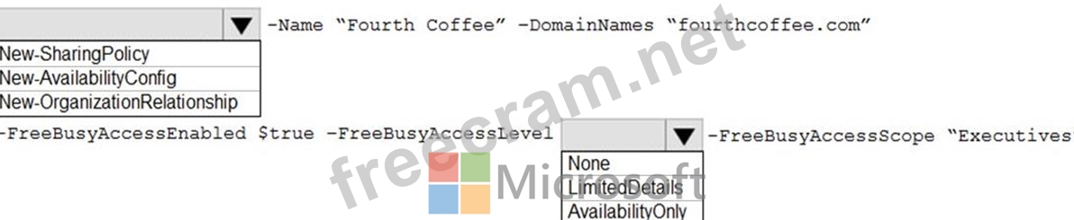 You need to ensure that the users at your company share free busy information with the users at Fourth Coffee. The solution must ensure that the meeting details included in the calendars of your company users remain hidden from the Fourth Coffee users.