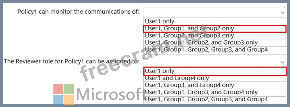 You need to identify whose communications can be monitored by Policy1, and who can be assigned the Reviewer role for Policy1.