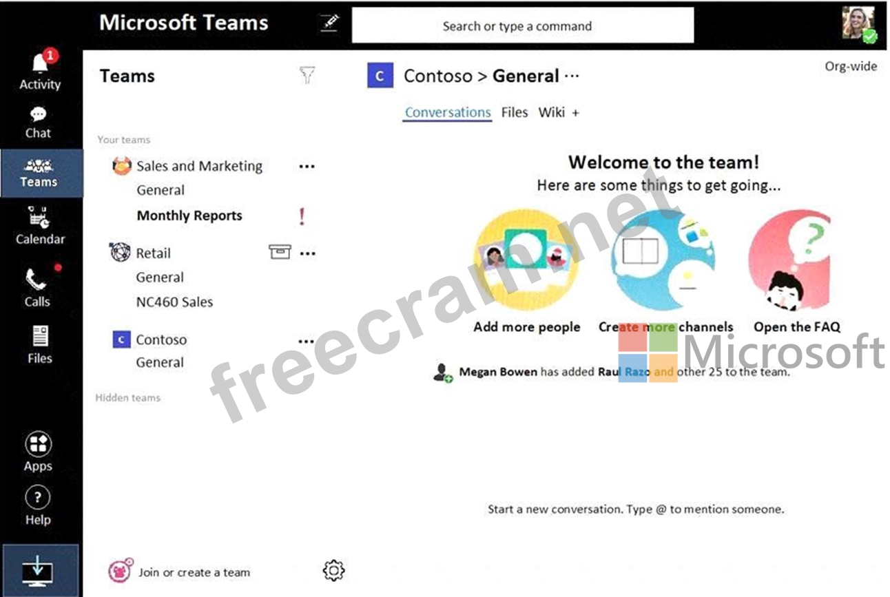 From the Microsoft Teams client, you review the teams shown in the exhibit. (Click the Exhibit tab.)