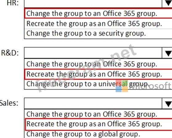 What should you do to each group? To answer, select the appropriate options in the answer area.
