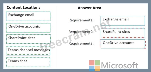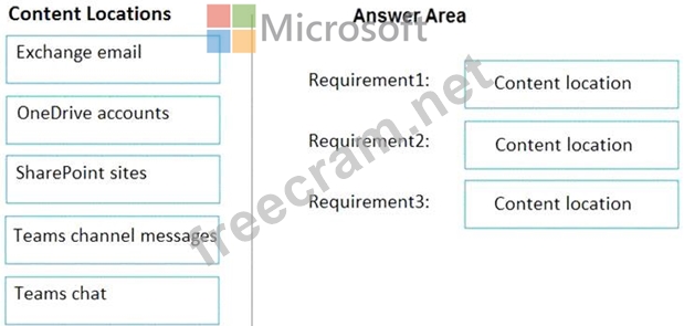 Which content location should you include in the retention policies? To answer, drag the appropriate content locations to the correct requirements. Each content location may be used once, more than once, or not at all.