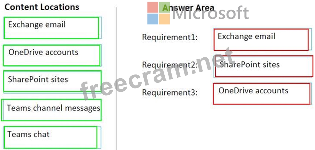 Which content location should you include in the retention policies? To answer, drag the appropriate content locations to the correct requirements. Each content location may be used once, more than once, or not at all. You may need to drag the split bar between panes or scroll to view content.