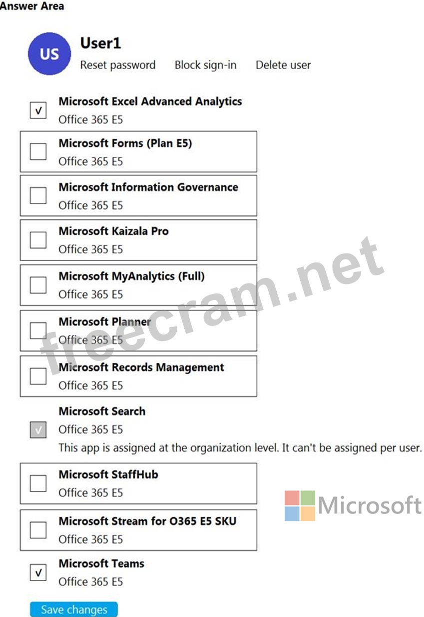 Which two additional licenses should you assign to User1? To answer, select the appropriate settings in the