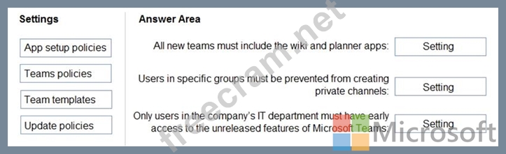 What should you configure for each requirement? To answer, drag the appropriate settings to the correct requirements. Each setting may be used once, more than once, or not at all. You may need to drag the split bar between panes or scroll to view content.