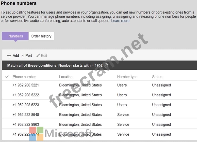 The available phone numbers are shown in the Phone numbers exhibit. (Click the Phone Numbers tab.)