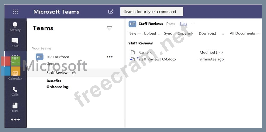 The files in the Staff Reviews channel are shown in the Files exhibit.