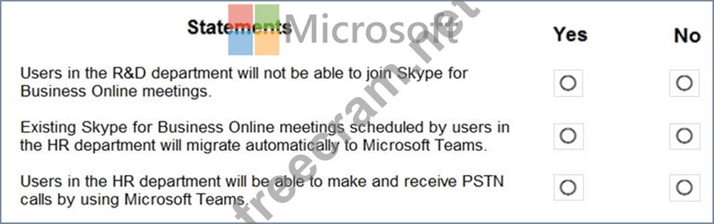 Your company uses Microsoft Skype for Business Online and Microsoft Teams.