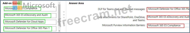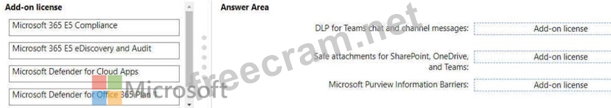 You need to purchase add-on licenses that will enable the following features for the Teams environment Microsoft Purview Information Barriers Data loss prevention (DIP) for Teams chat and channel messages Safe attachments for Microsoft SharePoint OneDrive and Teams To answer, drag the appropriate reports to the correct requirements. Each report may be used once, more than once, or not at all.