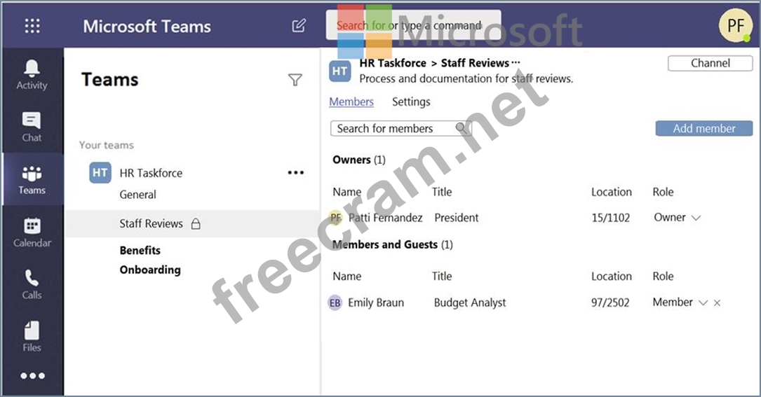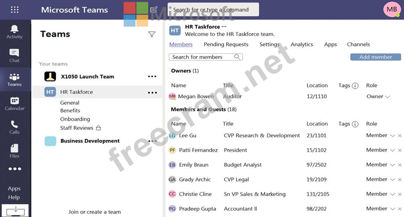 Your company has a Microsoft Teams deployment that contains a team named HR Taskforce. The members of HR Taskforce are shown in the HR Taskforce exhibit.