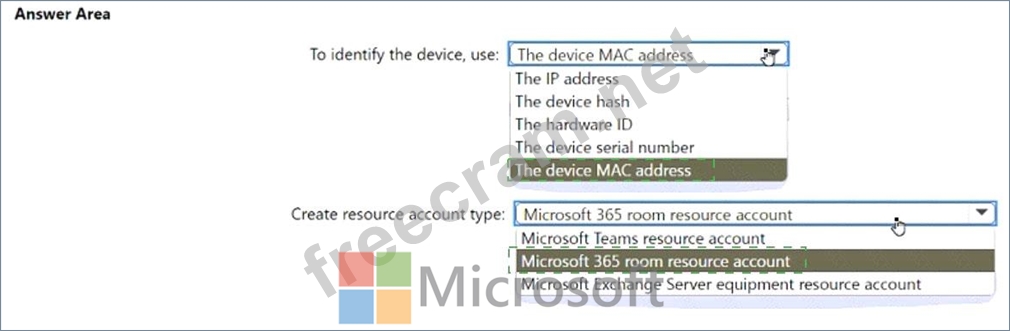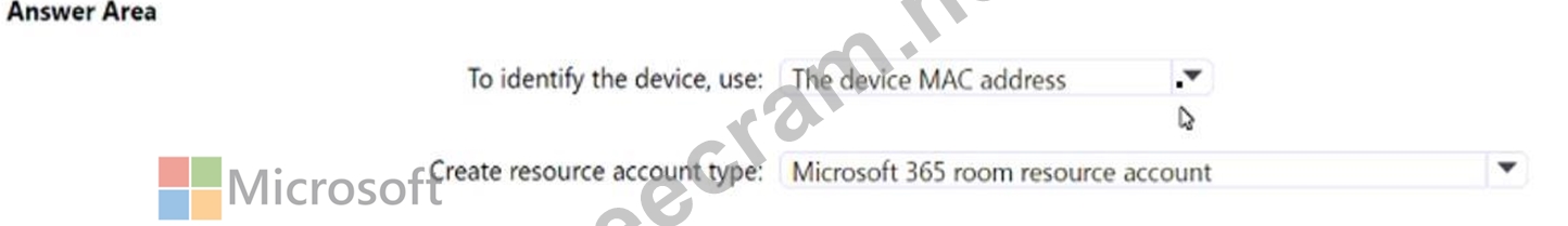 Which type of resource account should you create, and what should you use to identify the device? To answer, select the appropriate options in the answer area.