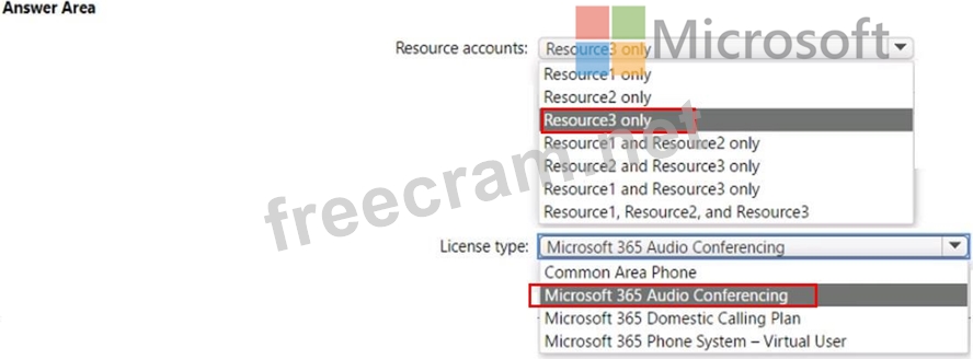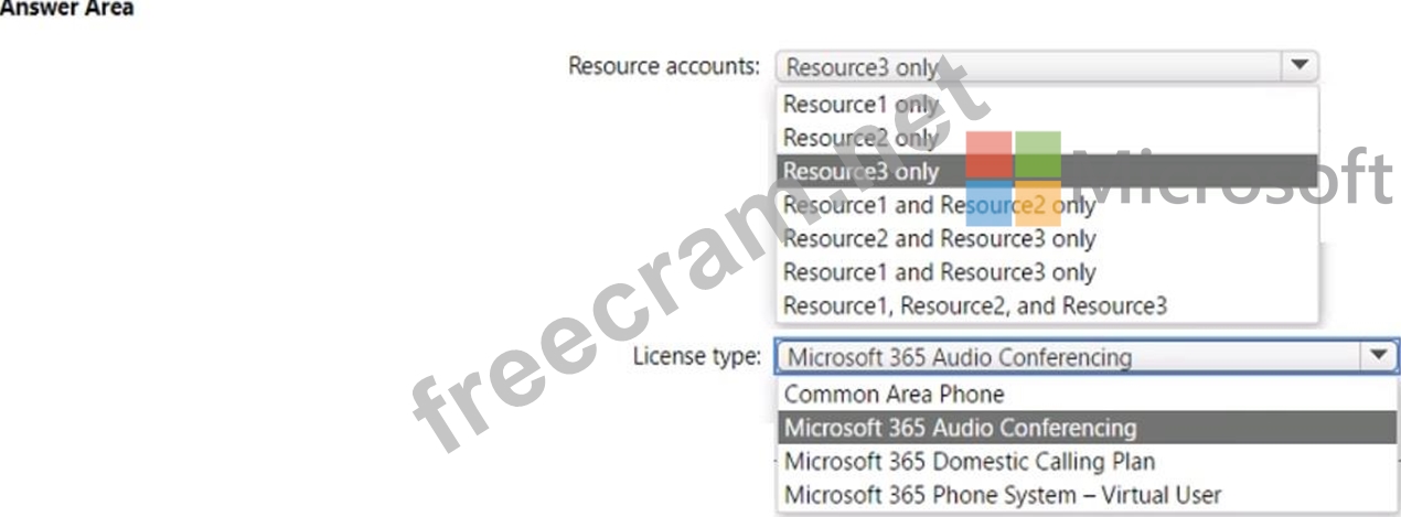 Which resource accounts require licenses, and which type of license is required? To answer, select the appropriate options in the answer area. NOTE: Each correct selection is worth one point.