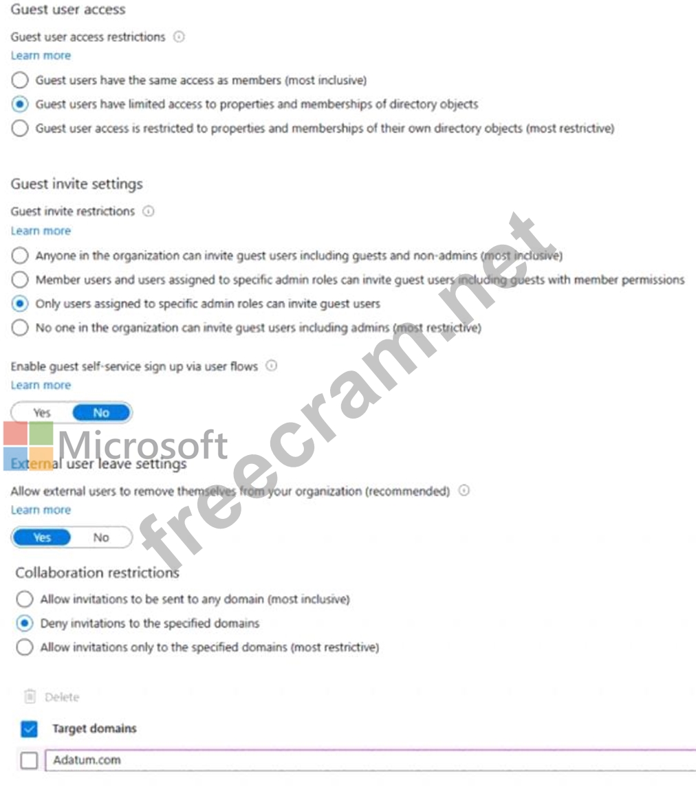 In Azure AO. the External collaboration settings are configured as shown in the exhibit (Click the Exhibit tab).