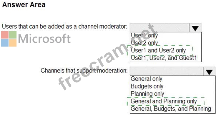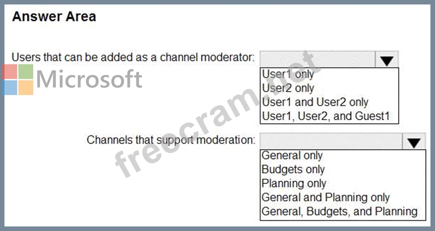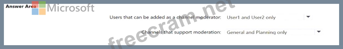 You need to identify which users can be added as a channel moderator, and which channels support moderation. What should you identify? To answer, select the appropriate options in the answer area. NOTE: