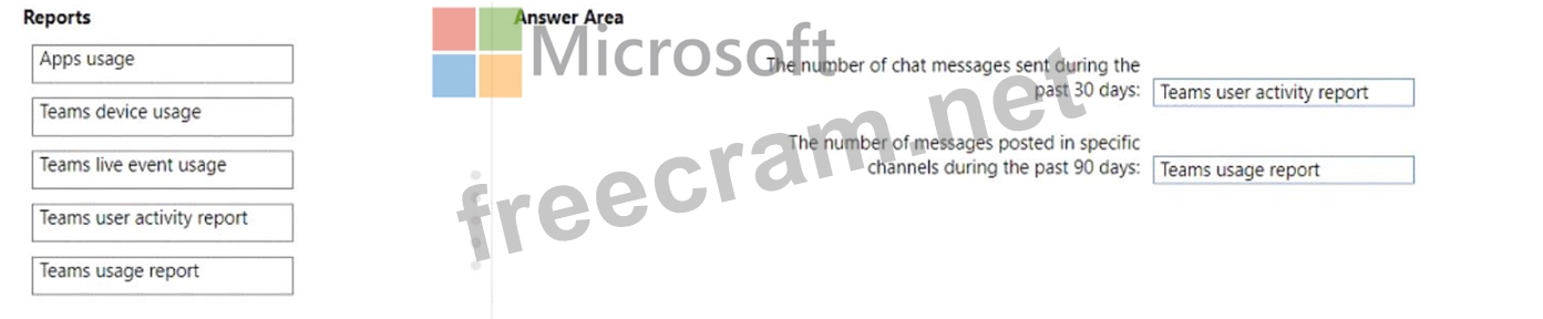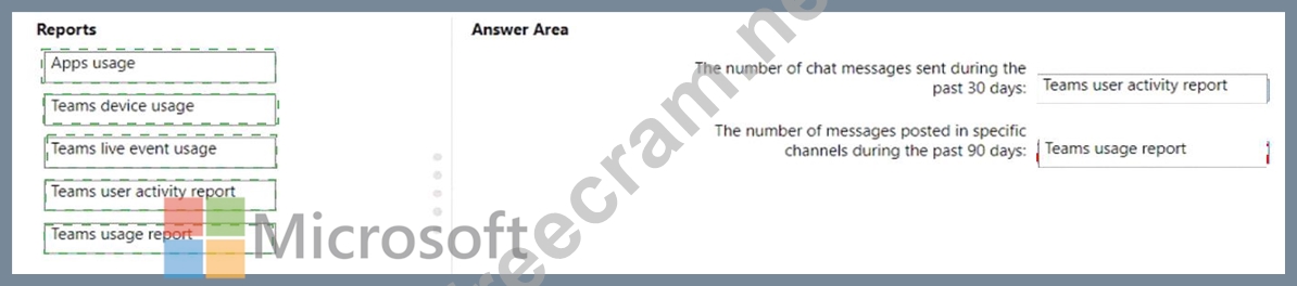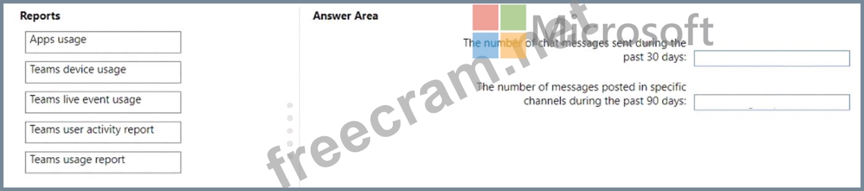 * The number of messages posted in specific channels during the past 90 days Which reports should use? To answer, drag the appropriate reports to the correct pieces of information. Each report may be used once, more than once, or not at all. You may need to drag the split bar between panes or scroll to view content.