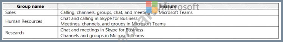 You plan to upgrade to Microsoft Teams in stages based on groups. The features required by each group are shown in the following table.