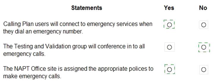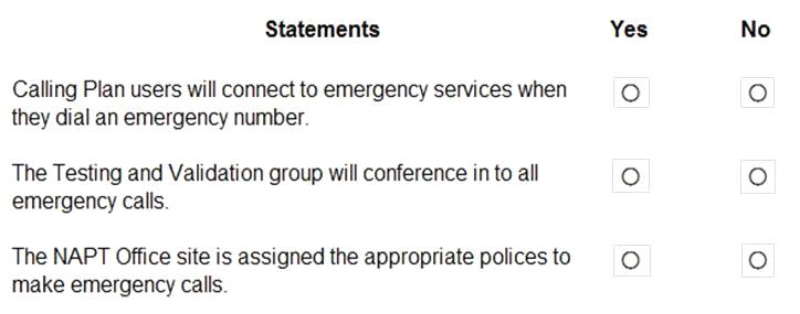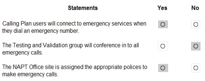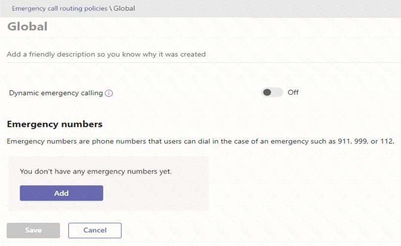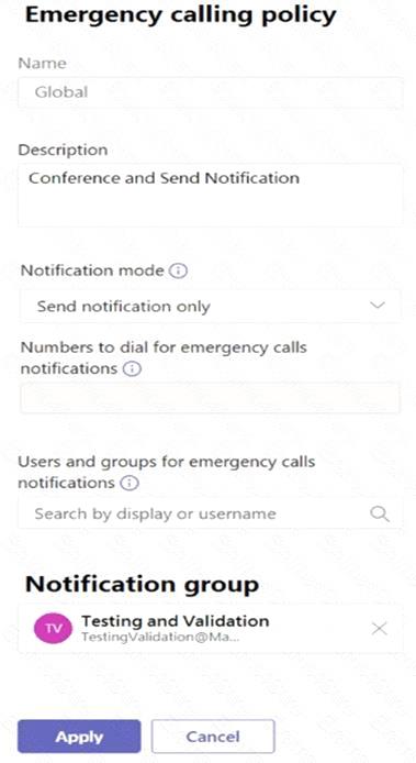 The global emergency calling policy is configured as shown in the Emergency Calling exhibit. (Click the Emergency Calling tab.)