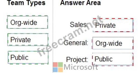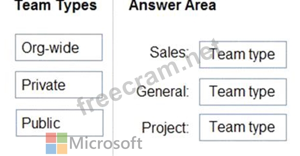 What should you configure each team? To answer, drag the appropriate team types to the correct teams. Each team type may be used once, more than once, or not at all. You may need to drag the split bar between panes or scroll to view content.