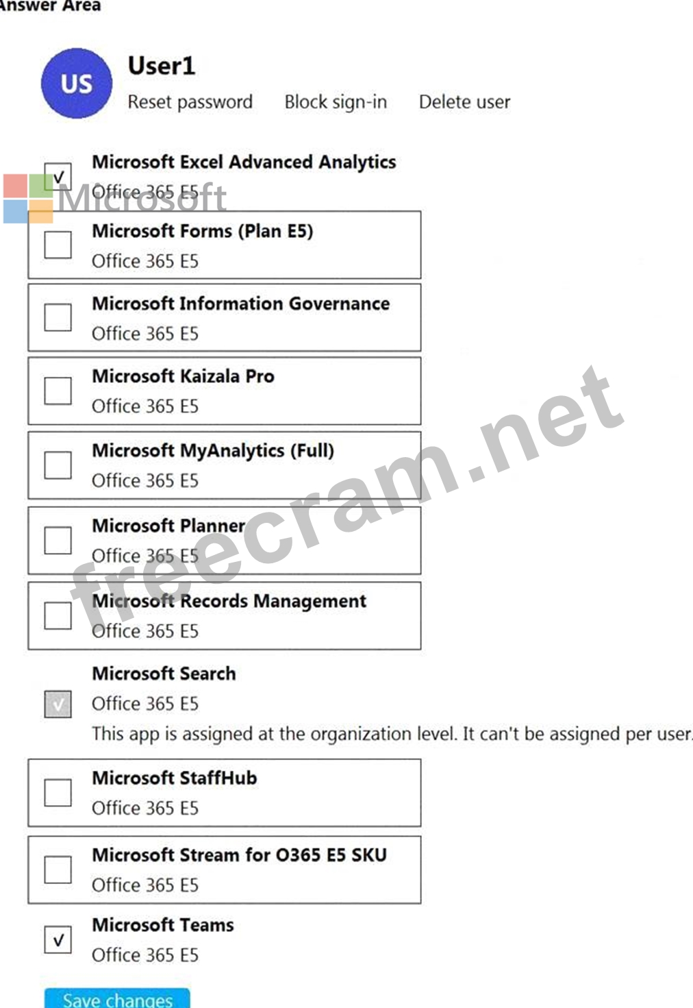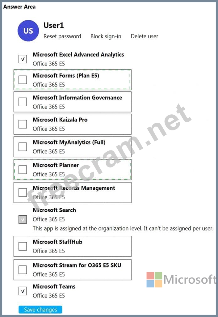 Which two additional licenses should you assign to User1? To answer, select the appropriate settings in the answer area.