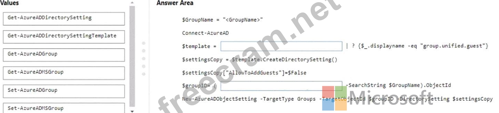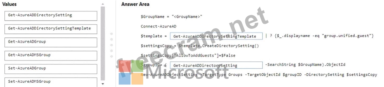 How should you complete the PowerShell script? To answer, drag the appropriate values to the correct targets. Each value may be used once, more than once, or not at all. You may need to drag the split bar between panes or scroll to view content.