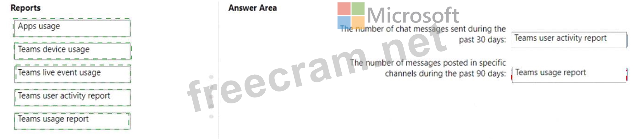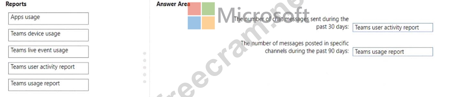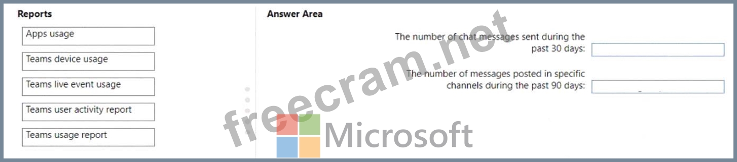 * The number of messages posted in specific channels during the past 90 days Which reports should use? To answer, drag the appropriate reports to the correct pieces of information. Each report may be used once, more than once, or not at all. You may need to drag the split bar between panes or scroll to view content.