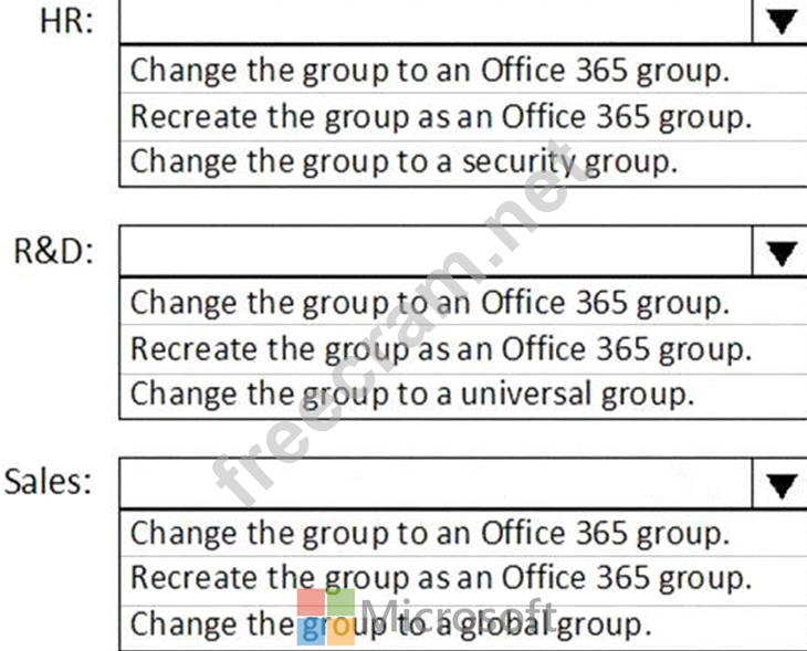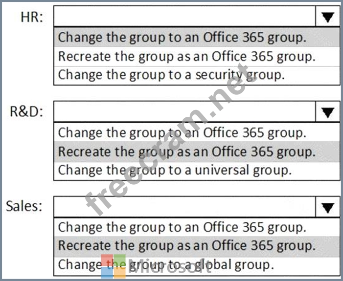 What should you do to each group? To answer, select the appropriate options in the answer area.
