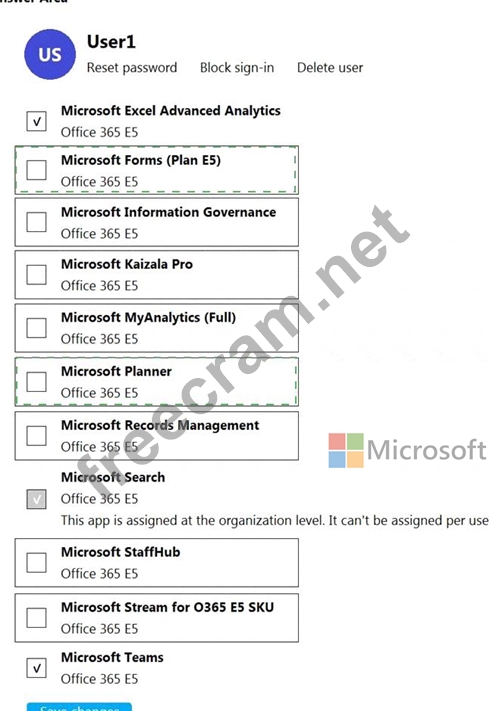 Which two additional licenses should you assign to User1? To answer, select the appropriate settings in the answer area.