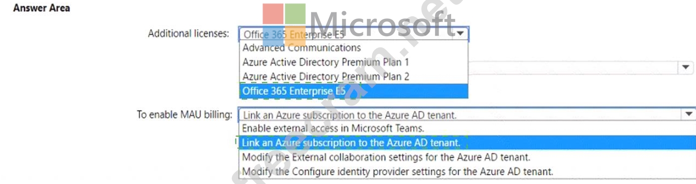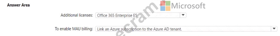 Which additional licenses should you assign, and what should you do to enable MAU billing? To answer, select the appropriate options in the answer area.