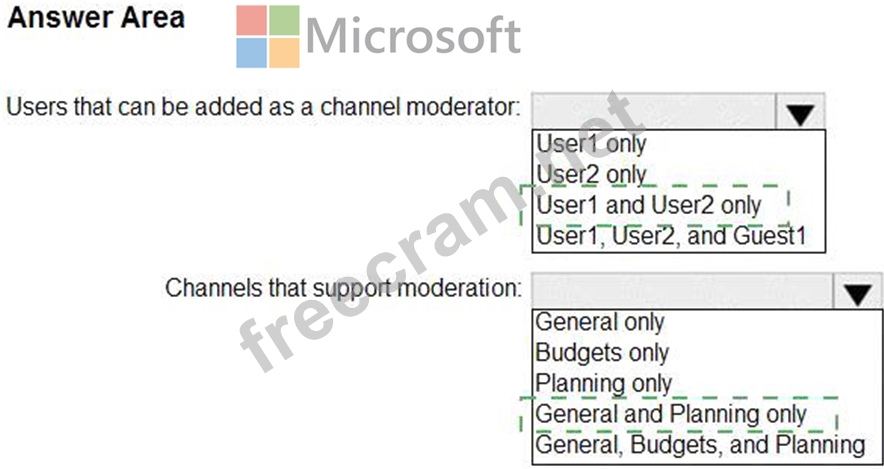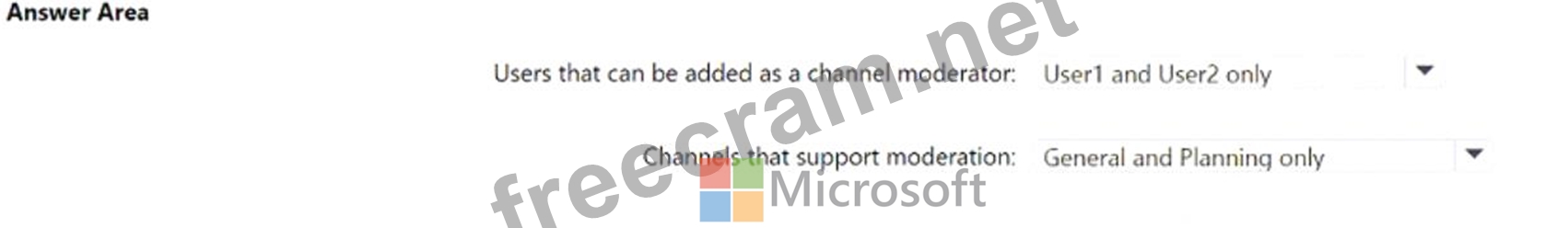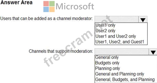 You need to identify which users can be added as a channel moderator, and which channels support moderation. What should you identify? To answer, select the appropriate options in the answer area. NOTE: