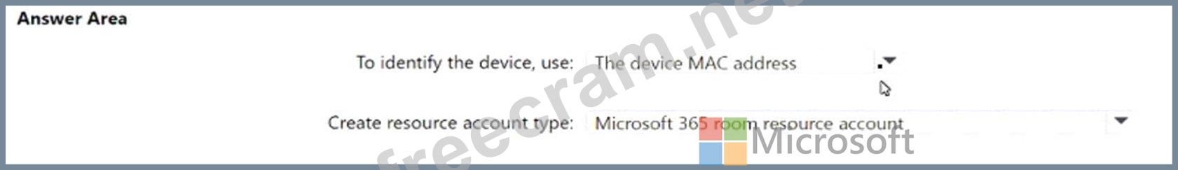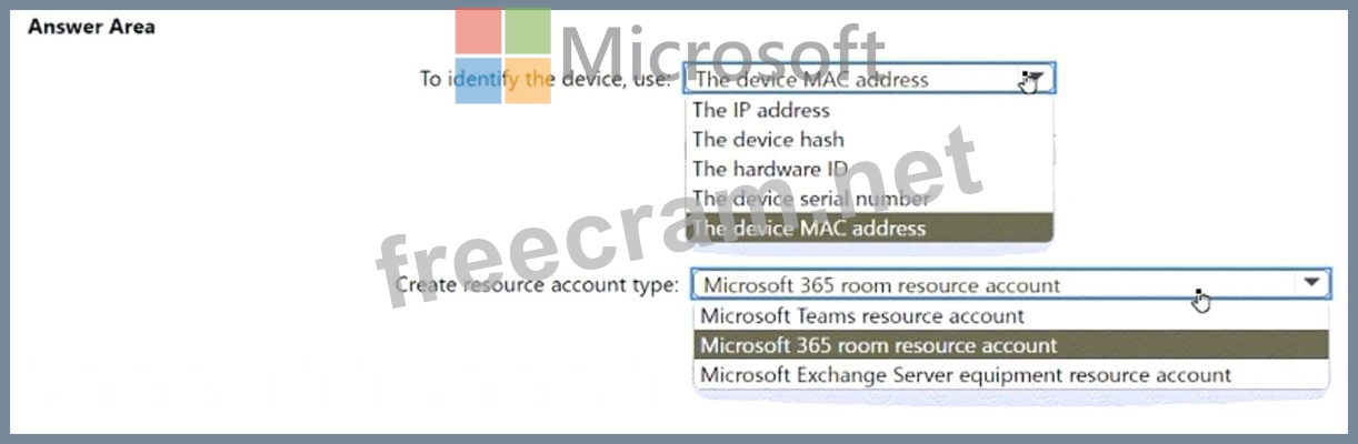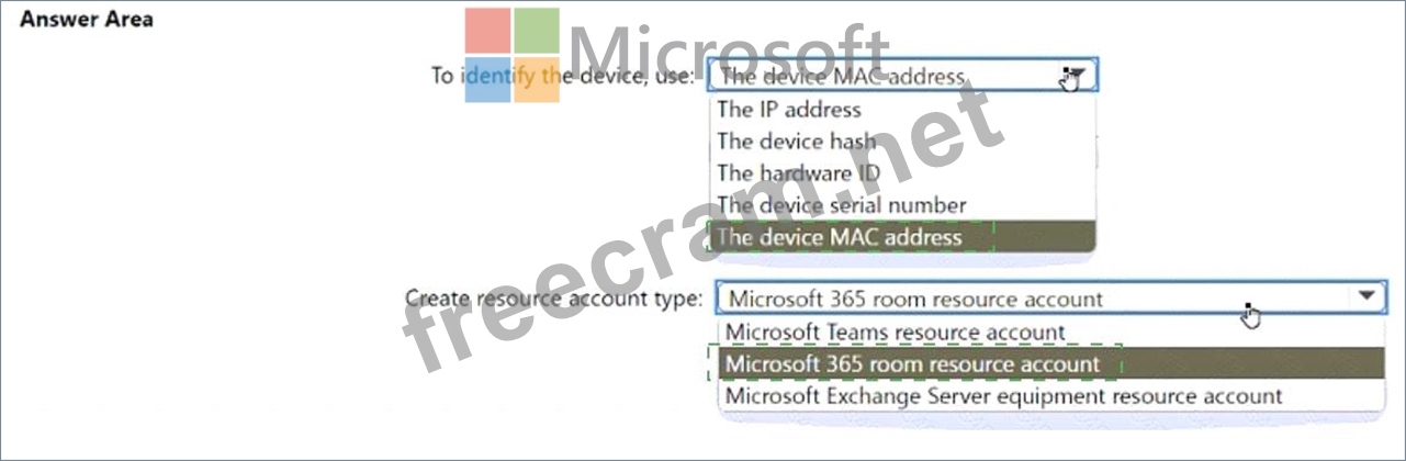 Which type of resource account should you create, and what should you use to identify the device? To answer, select the appropriate options in the answer area.