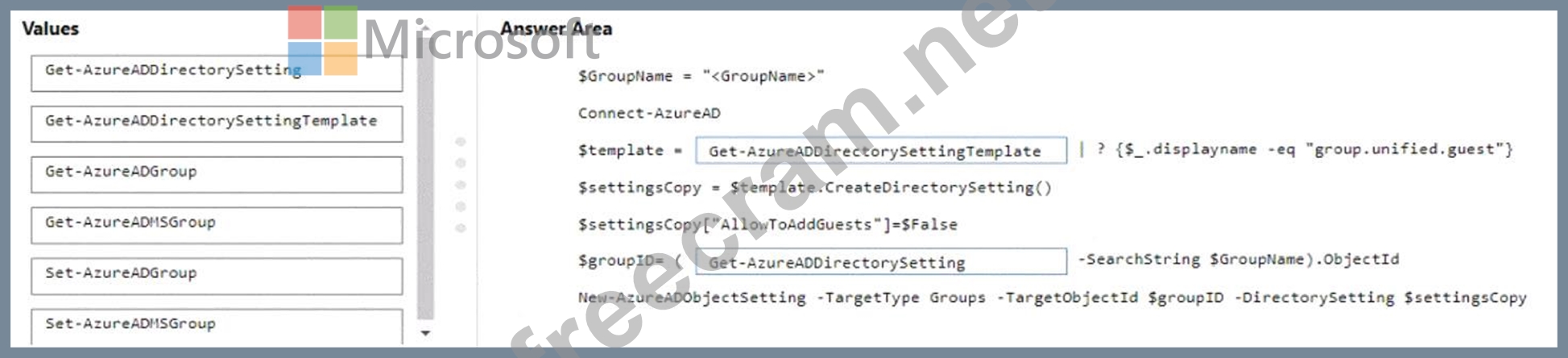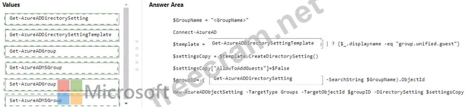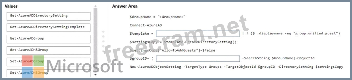 How should you complete the PowerShell script? To answer, drag the appropriate values to the correct targets. Each value may be used once, more than once, or not at all. You may need to drag the split bar between panes or scroll to view content.