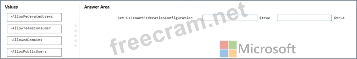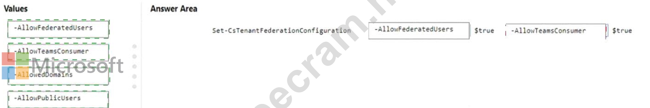 How should you complete the PowerShell cmdlets? To answer, drag the appropriate values to the correct targets. Each value may be used once, more than once, or not at all. You may need to drag the split bar between panes or scroll to view content.