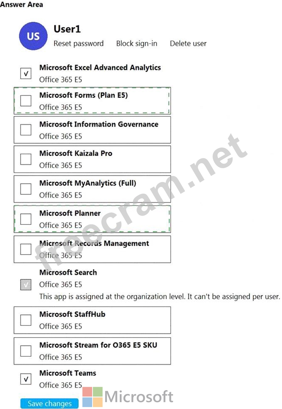 Which two additional licenses should you assign to User1? To answer, select the appropriate settings in the answer area.