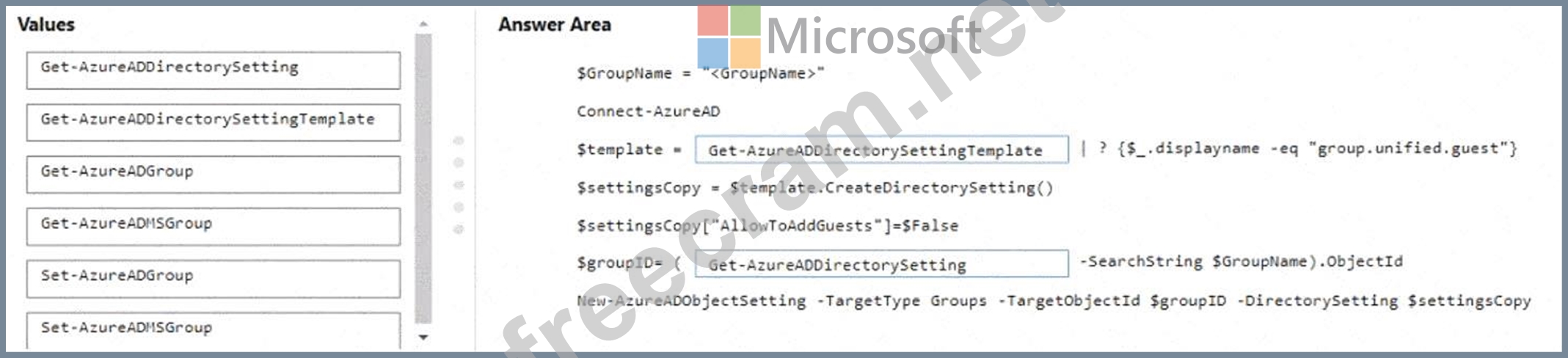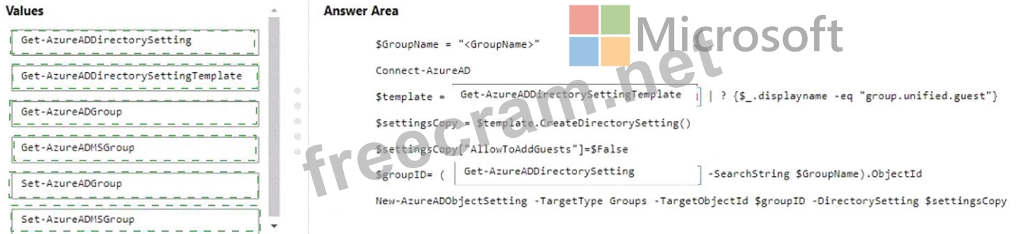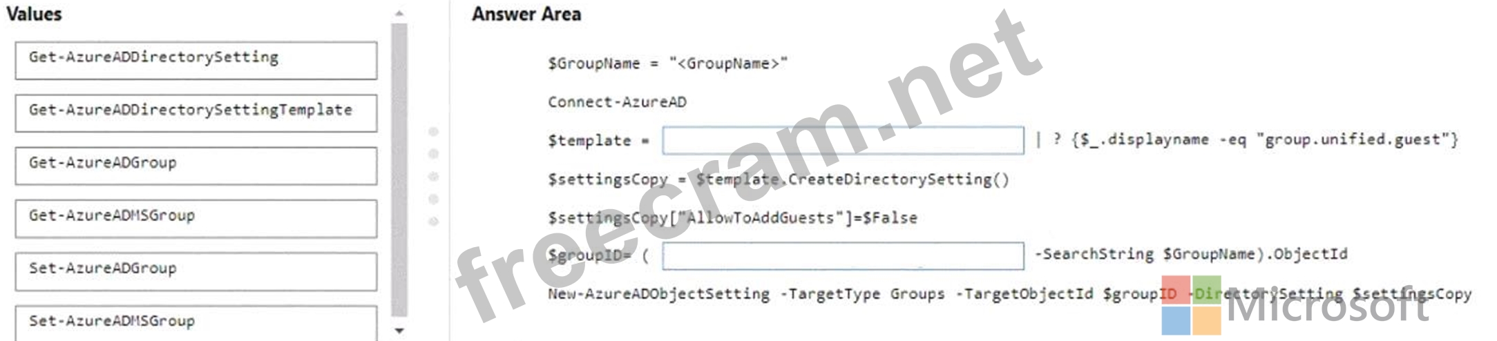 How should you complete the PowerShell script? To answer, drag the appropriate values to the correct targets. Each value may be used once, more than once, or not at all. You may need to drag the split bar between panes or scroll to view content.