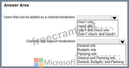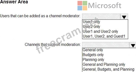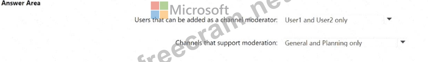 You need to identify which users can be added as a channel moderator, and which channels support moderation. What should you identify? To answer, select the appropriate options in the answer area. NOTE: