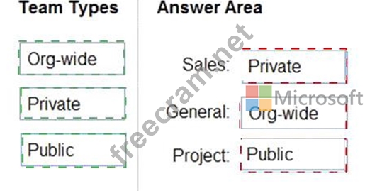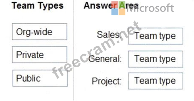What should you configure each team? To answer, drag the appropriate team types to the correct teams. Each team type may be used once, more than once, or not at all. You may need to drag the split bar between panes or scroll to view content.