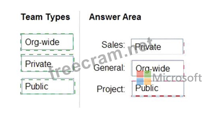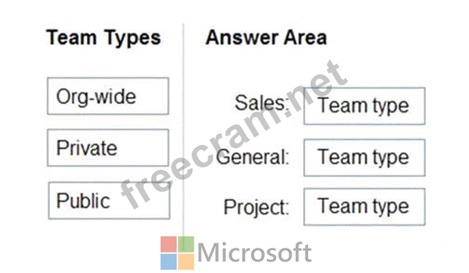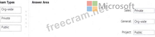 What should you configure each team? To answer, drag the appropriate team types to the correct teams. Each team type may be used once, more than once, or not at all. You may need to drag the split bar between panes or scroll to view content.